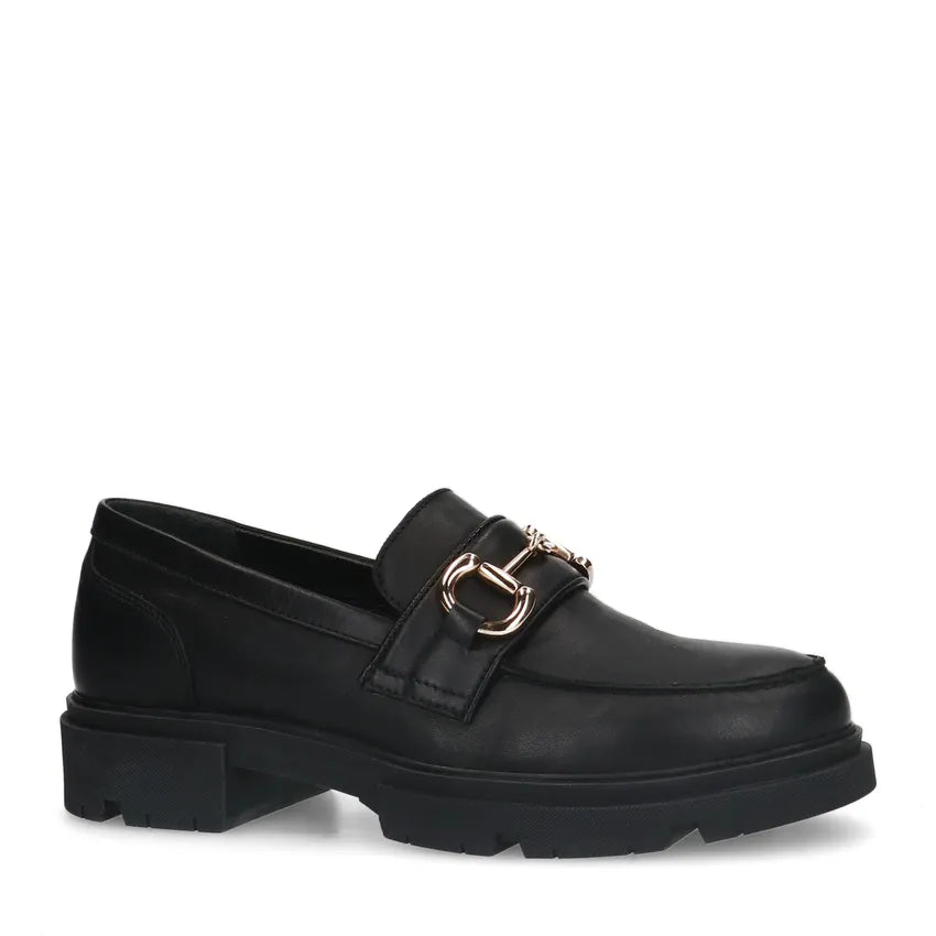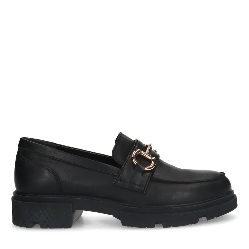Women's Black Leather Loafers | Chunky Sole | Gold Detail