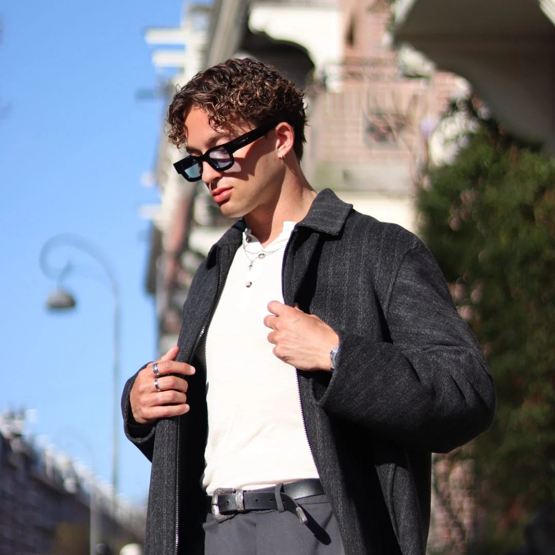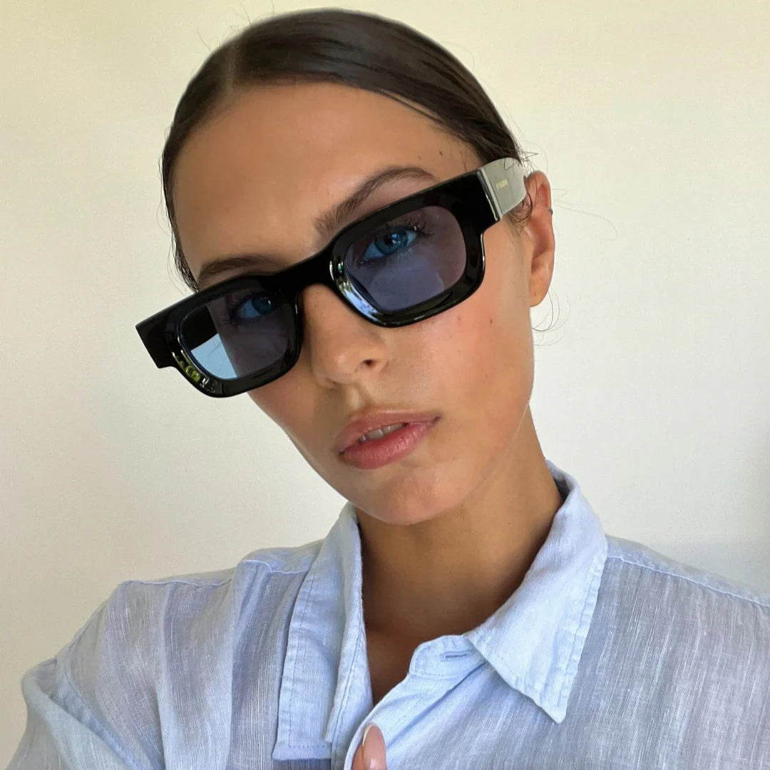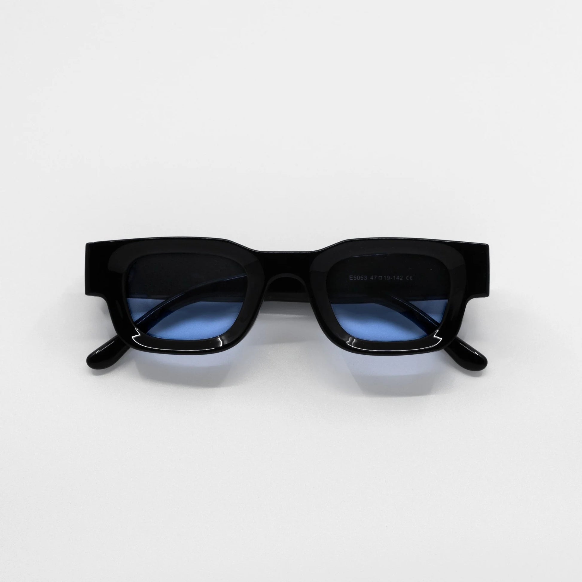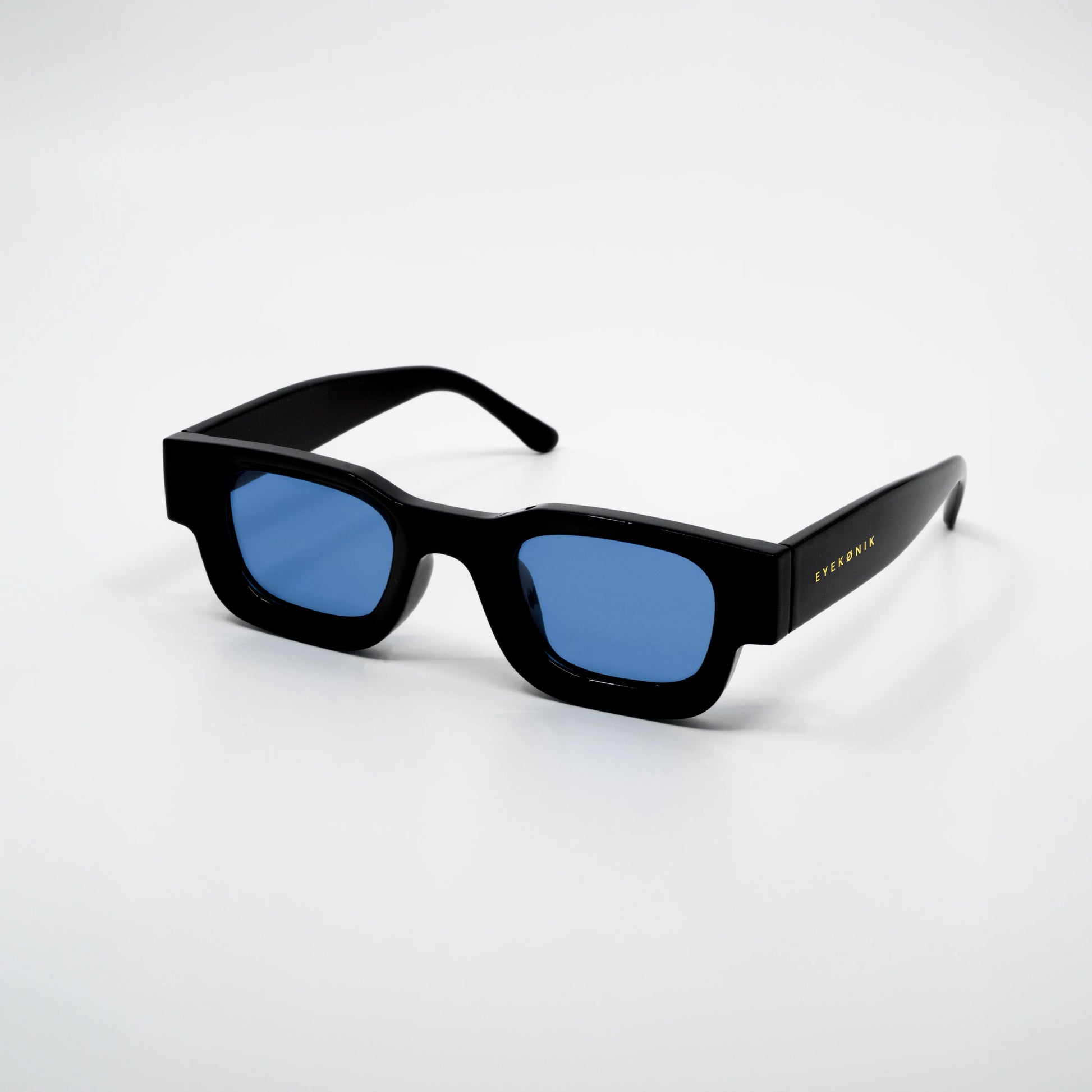 De Nova zonnebril is voor wie niet bang is om op te vallen. Het krachtige, vierkante montuur in hoogglans zwart vormt een perfect contrast met de koelblauwe glazen — een combinatie die direct indruk maakt.