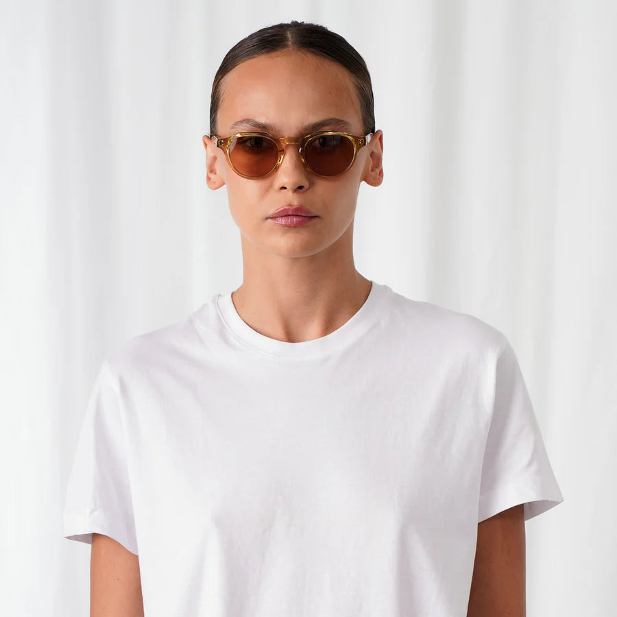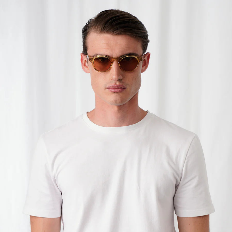 Amber Vault is een tijdcapsule van stijl. Met een goud-amberkleurig montuur en bijpassende warme glazen straalt deze zonnebril karakter en zelfverzekerdheid uit.