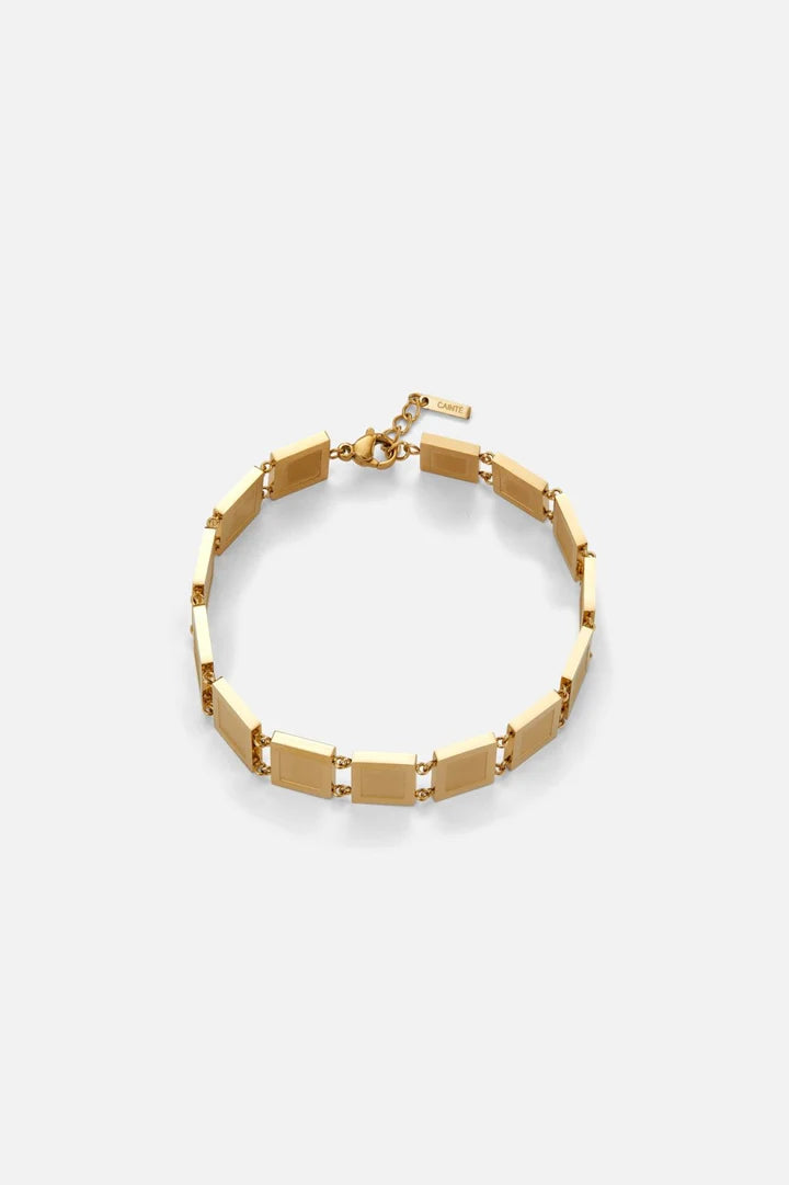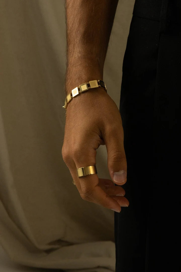 De Benjamin armband straalt zelfvertrouwen en stijl uit met zijn robuuste blokdesign en gouden metalen afwerking. Een opvallend accessoire voor de moderne man die durft te onderscheiden.