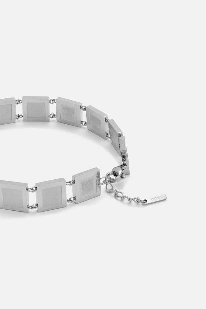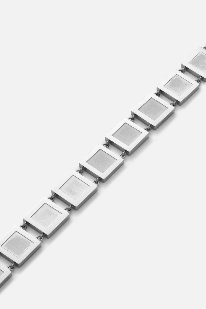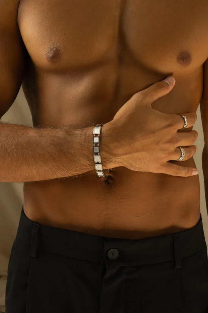 De Carlos armband combineert een strak blokdesign met een koele, zilveren afwerking. Een stijlvol accessoire dat kracht en elegantie perfect in balans brengt.