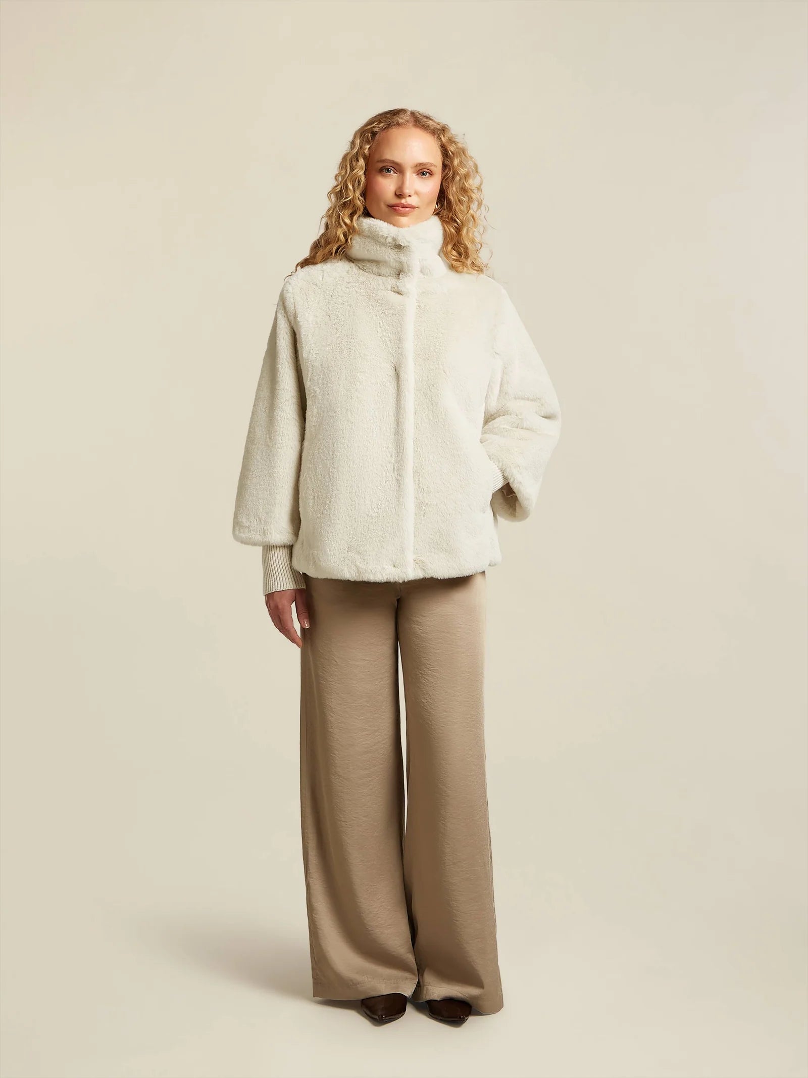 Luxe dames winterjas in een zachte faux fur stof met een hoge opstaande kraag voor extra warmte. De jas heeft een verborgen ritssluiting, lange mouwen met ribboorden en een comfortabele pasvorm. Perfect voor een stijlvolle en warme look tijdens koude dagen. Gratis verzending en 30 dagen retourgarantie.