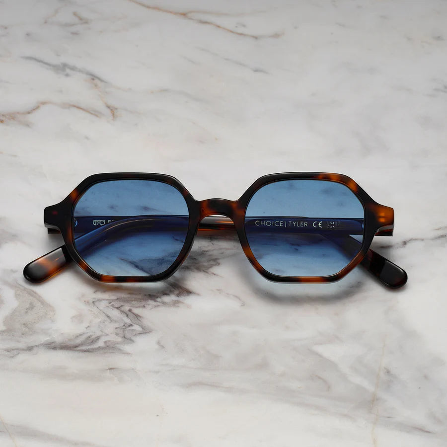 Echo | Achthoekige zonnebril met tortoise montuur en blauwe glazen