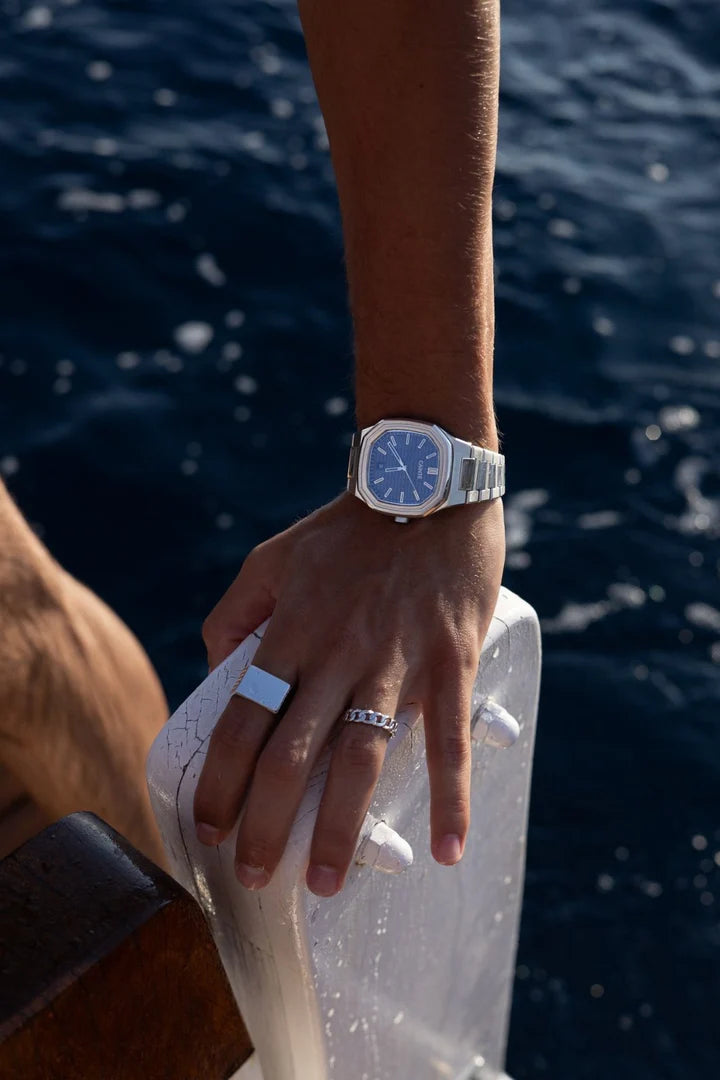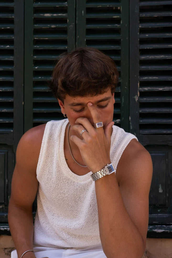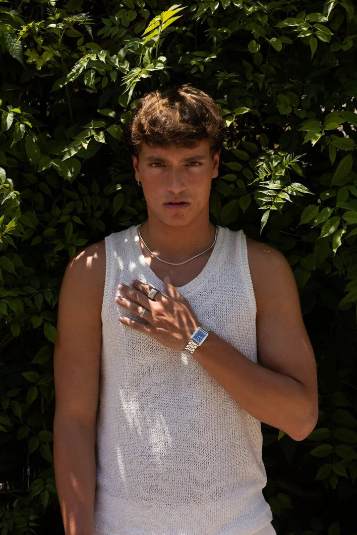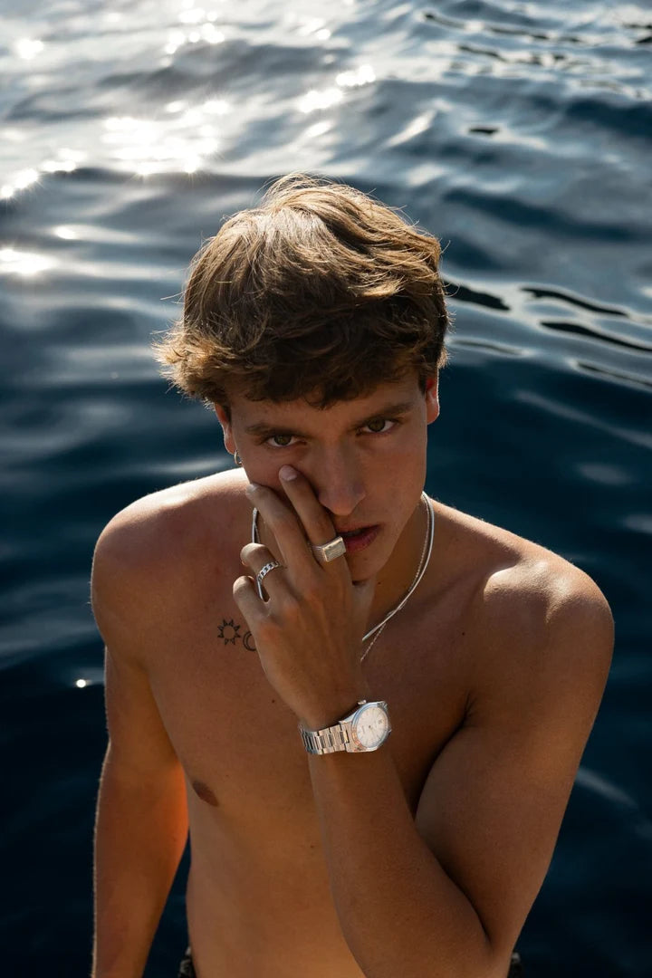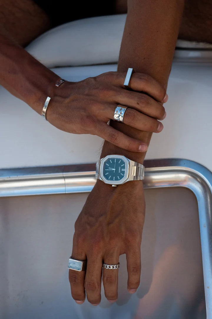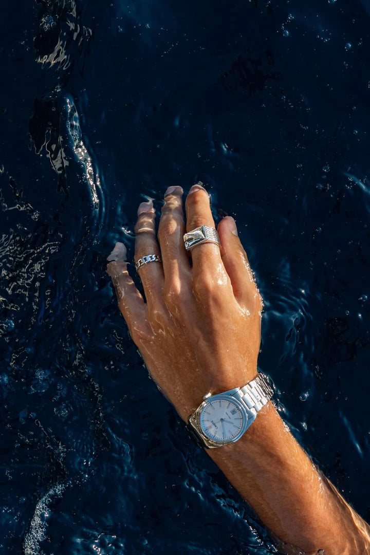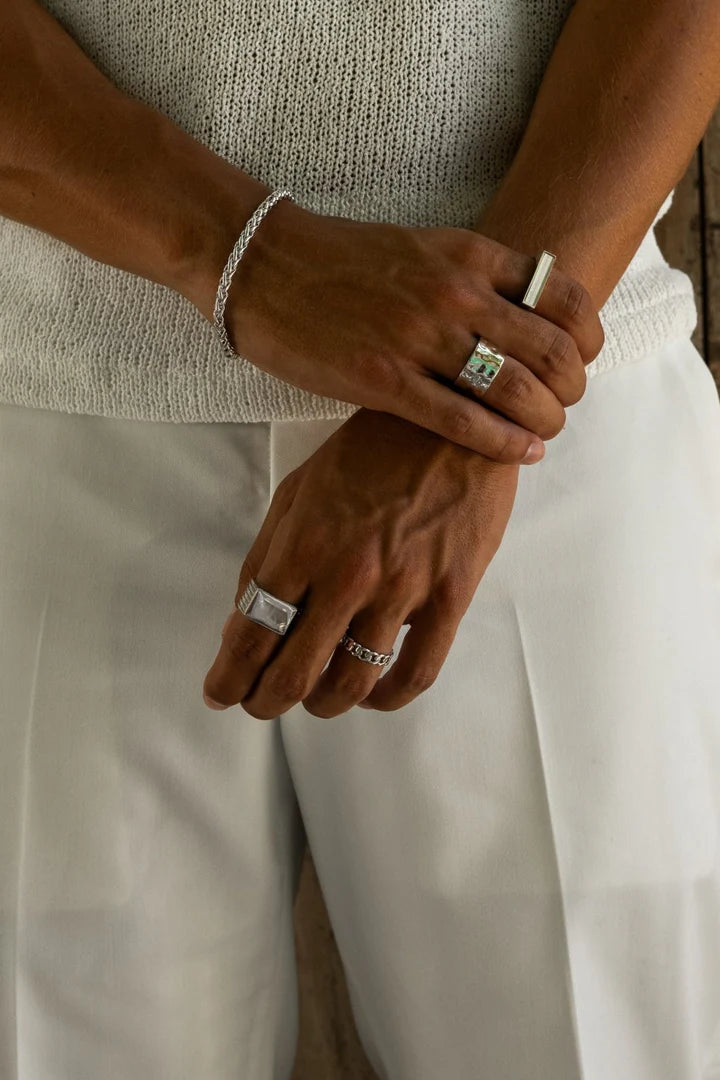 De Norris ring is een verfijnd accessoire met een klassiek Cuban chain-patroon, uitgevoerd in een tijdloze zilverkleur. Een krachtig sieraad dat moeiteloos stoer en elegant combineert.