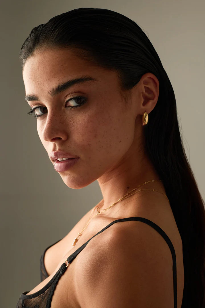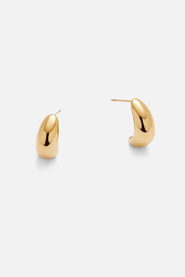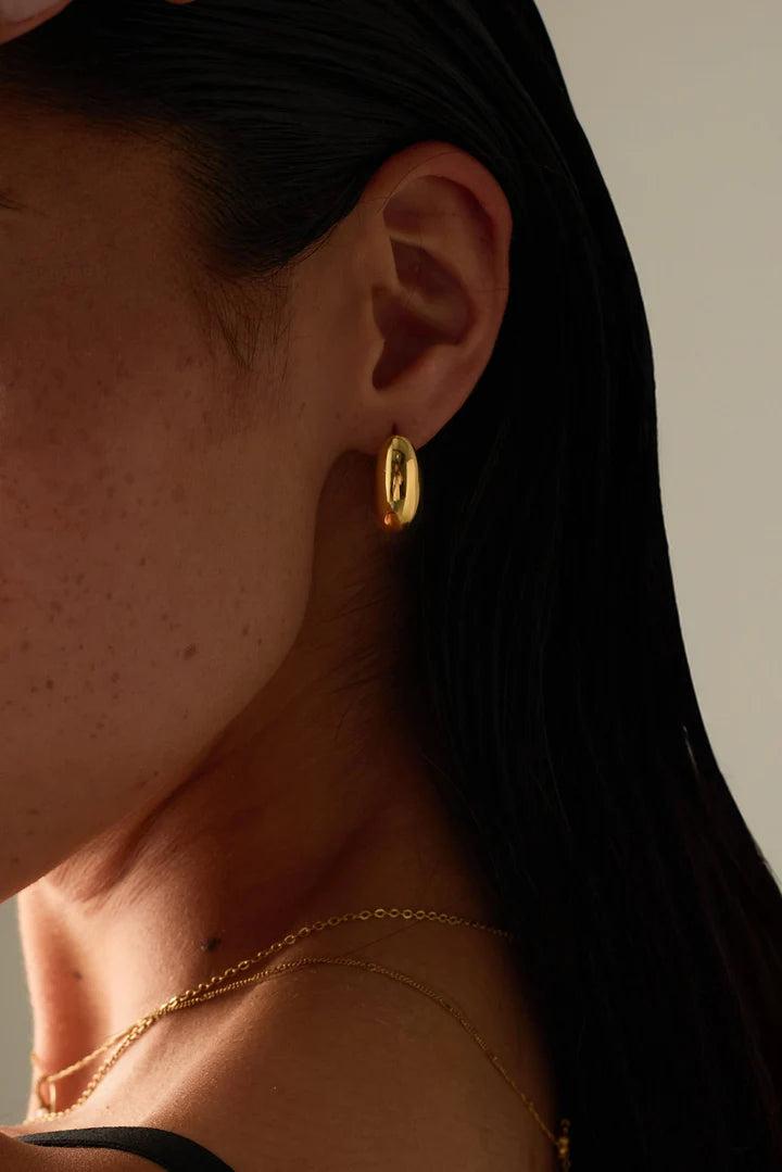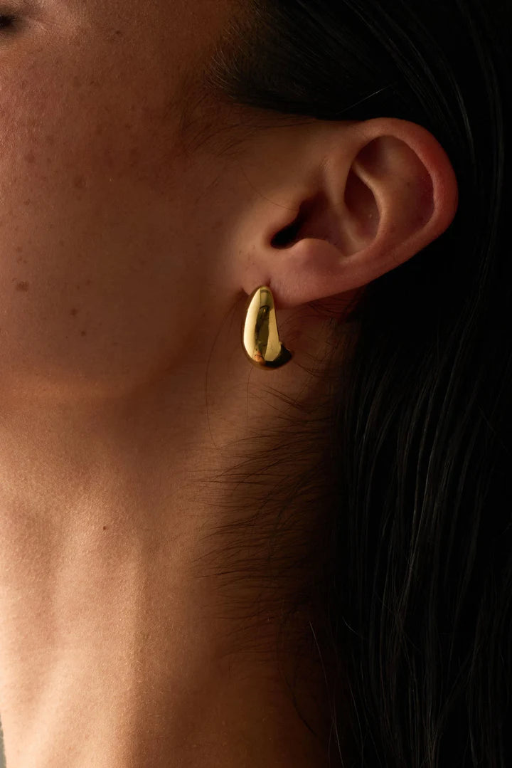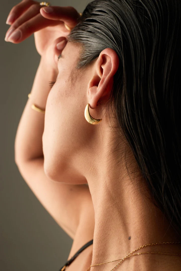 Deze goudkleurige oorbel is een statement van pure eenvoud. De vloeiende, organische vorm volgt de natuurlijke lijnen van je gezicht en zorgt voor een krachtige maar elegante uitstraling.
